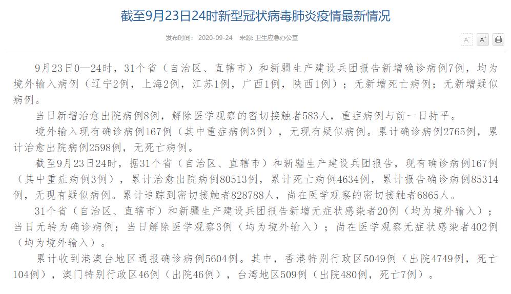 人民網(wǎng)北京9月24日電(董童)國(guó)家衛(wèi)生健康委于今日在官網(wǎng)發(fā)布的《截至9月23日24時(shí)新型冠狀病毒肺炎疫情最新情況》(以下簡(jiǎn)稱“情況”)提出,9月23日0—24時(shí),31個(gè)?。ㄗ灾螀^(qū)、直轄市)和新疆生產(chǎn)建設(shè)兵團(tuán)報(bào)告新增確診病例7例,均為境外輸入病例(遼寧2例,上海2例,江蘇1例,廣西1例,陜西1例);無新增死亡病例;無新增疑似病例。當(dāng)日新增治愈出院病例8例,解除醫(yī)學(xué)觀察的密切接觸者583人,重癥病例與前一日持平。