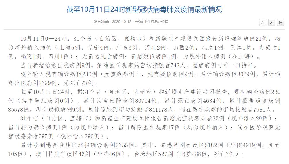 人民網(wǎng)北京10月12日電(董童)國家衛(wèi)生健康委于今日在官網(wǎng)發(fā)布的《截至10月11日24時新型冠狀病毒肺炎疫情最新情況》(以下簡稱“情況”)提出,10月11日0—24時,31個?。ㄗ灾螀^(qū)、直轄市)和新疆生產(chǎn)建設(shè)兵團(tuán)報告新增確診病例21例,均為境外輸入病例(上海5例,遼寧4例,廣東3例,河北2例,山西2例,北京1例,天津1例,內(nèi)蒙古1例,福建1例,四川1例);無新增死亡病例;新增疑似病例1例,為境外輸入病例(在上海)。當(dāng)日新增治愈出院病例9例,解除醫(yī)學(xué)觀察的密切接觸者742人,重癥病例與前一日持平。