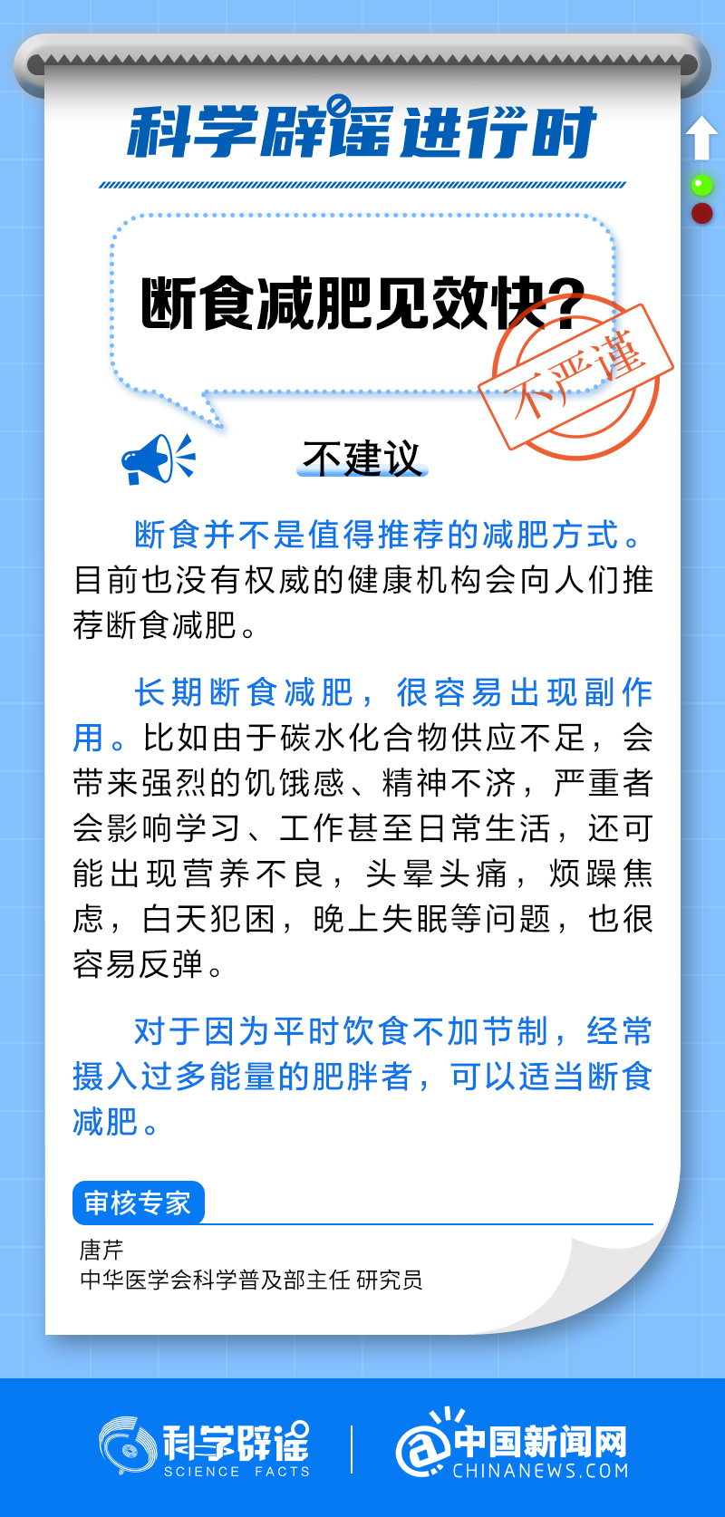 中新網(wǎng)12月26日電 斷食并不是值得推薦的減肥方式。目前也沒(méi)有權(quán)威的健康機(jī)構(gòu)會(huì)向人們推薦斷食減肥。長(zhǎng)期斷食減肥,很容易出現(xiàn)多種副作用。(來(lái)源:@科學(xué)辟謠 中國(guó)新聞網(wǎng)微博)