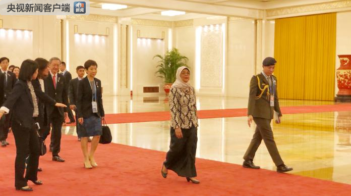 △前來與習(xí)近平會面的新加坡總統(tǒng)哈莉瑪。(央視記者許永松拍攝)
