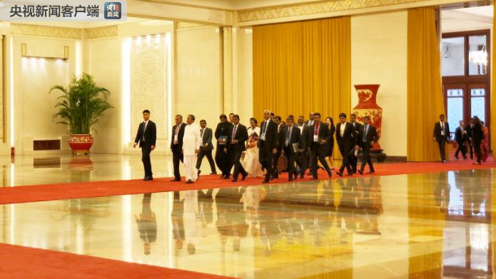 △斯里蘭卡總統(tǒng)西里塞納率團抵達人民大會堂與習(xí)近平會面。(央視記者許永松拍攝)