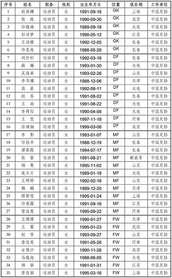 人民網(wǎng)北京5月18日電(楊磊)5月18日,中國足協(xié)在其官網(wǎng)公布了女足國家隊里約奧運會參賽運動員35人大名單。馬曉旭、王霜等人在列,門將王飛沒有進入此次大名單。
