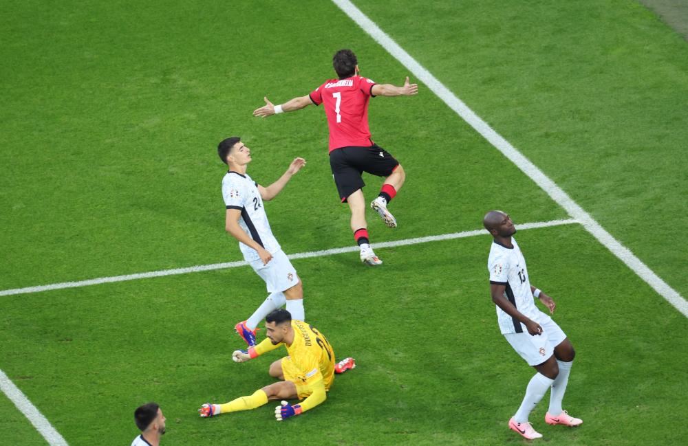 6月26日,格魯吉亞隊球員克瓦拉茨赫利亞(上)慶祝進球。當日,在德國蓋爾森基興進行的2024歐洲足球錦標賽F組第三輪比賽中,葡萄牙隊0比2不敵格魯吉亞隊。新華社記者 白雪飛 攝