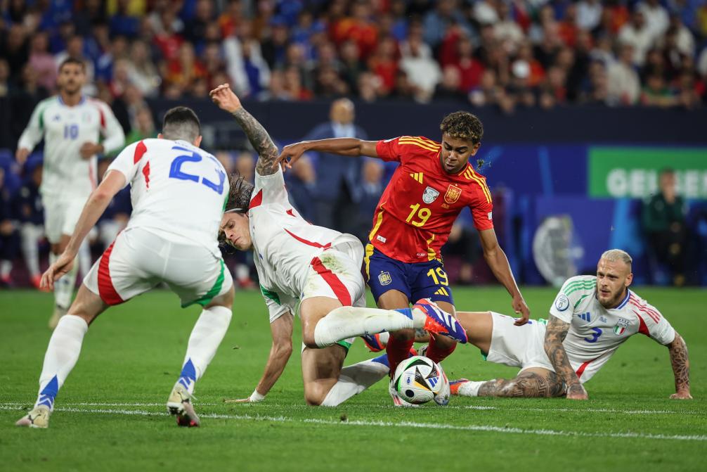 6月20日,西班牙隊球員亞馬爾(右二)在比賽中帶球突破。當日,在德國蓋爾森基興進行的2024歐洲足球錦標賽B組次輪比賽中,西班牙隊1比0戰(zhàn)勝意大利隊。新華社記者 潘昱龍 攝