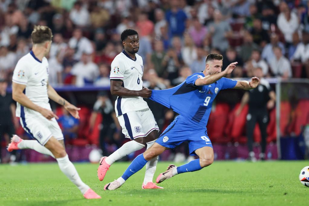 6月25日,英格蘭隊球員格希(中)在比賽中犯規(guī)。當日,在德國科隆進行的2024歐洲足球錦標賽C組第三輪比賽中,英格蘭隊0比0戰(zhàn)平斯洛文尼亞隊。新華社記者 白雪飛 攝
