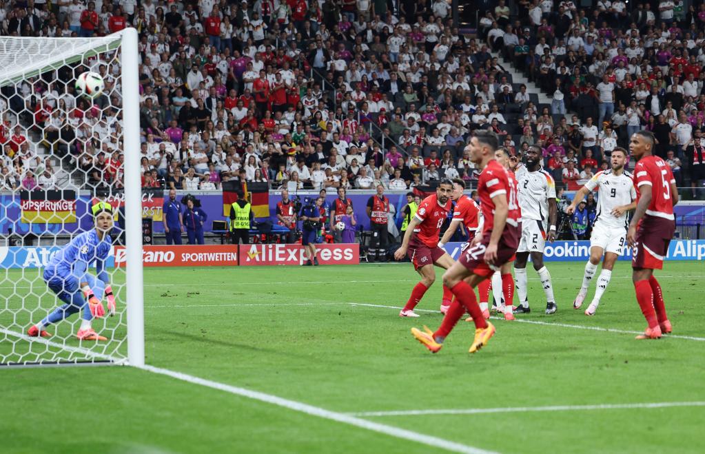 6月23日,德國隊球員菲爾克魯格(右二)破門得分。當日,在德國法蘭克福進行的2024歐洲足球錦標賽A組第三輪比賽中,德國隊1比1戰(zhàn)平瑞士隊。新華社記者 白雪飛 攝