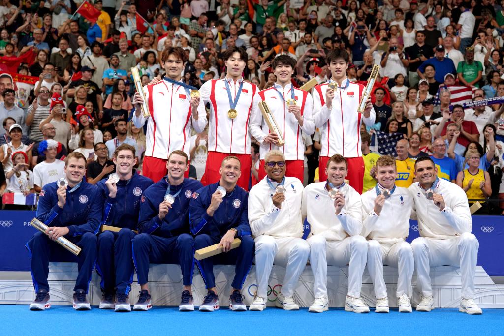 8月4日,冠軍中國(guó)隊(duì)(上)、亞軍美國(guó)隊(duì)(下左)、季軍法國(guó)隊(duì)在巴黎奧運(yùn)會(huì)游泳項(xiàng)目男子4x100米混合泳接力頒獎(jiǎng)儀式上。新華社記者 杜宇 攝