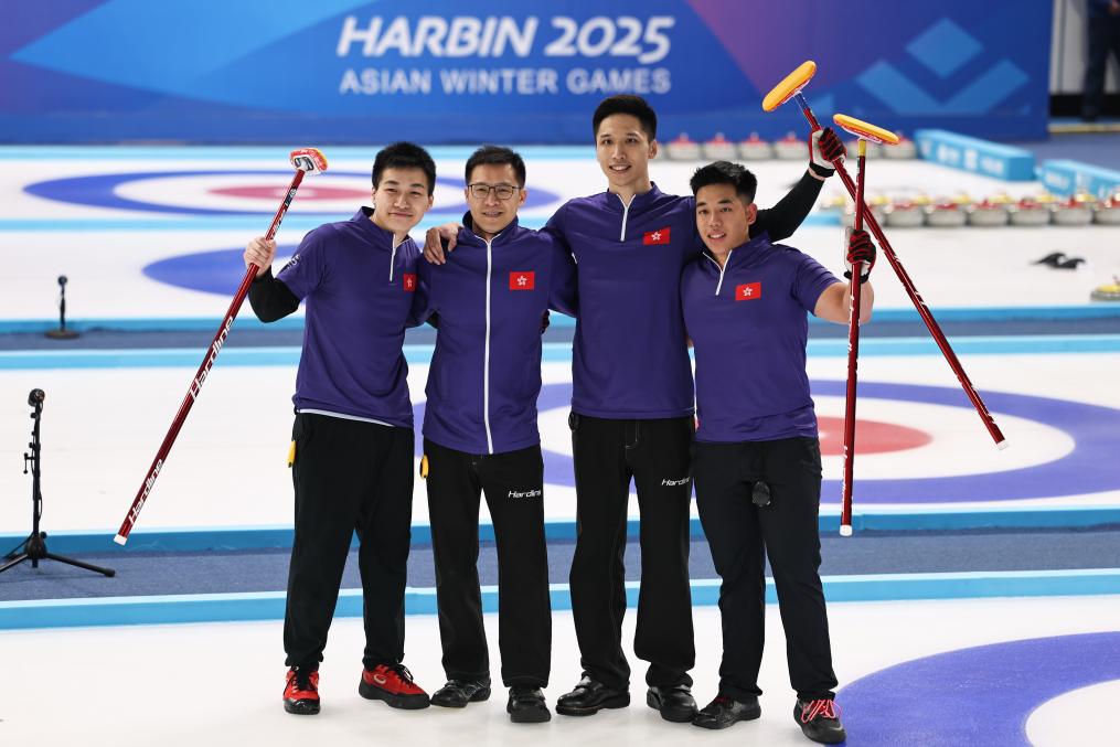 2月10日,中國香港隊選手鐘卓熙、張卓華、甄浩天、鄭政楠(左至右)在比賽后。新華社記者 鄭煥松 攝