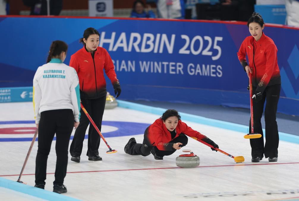 2月10日,中國隊選手蘇亭毓(右二)在比賽中擲壺。新華社記者 胡星宇 攝
