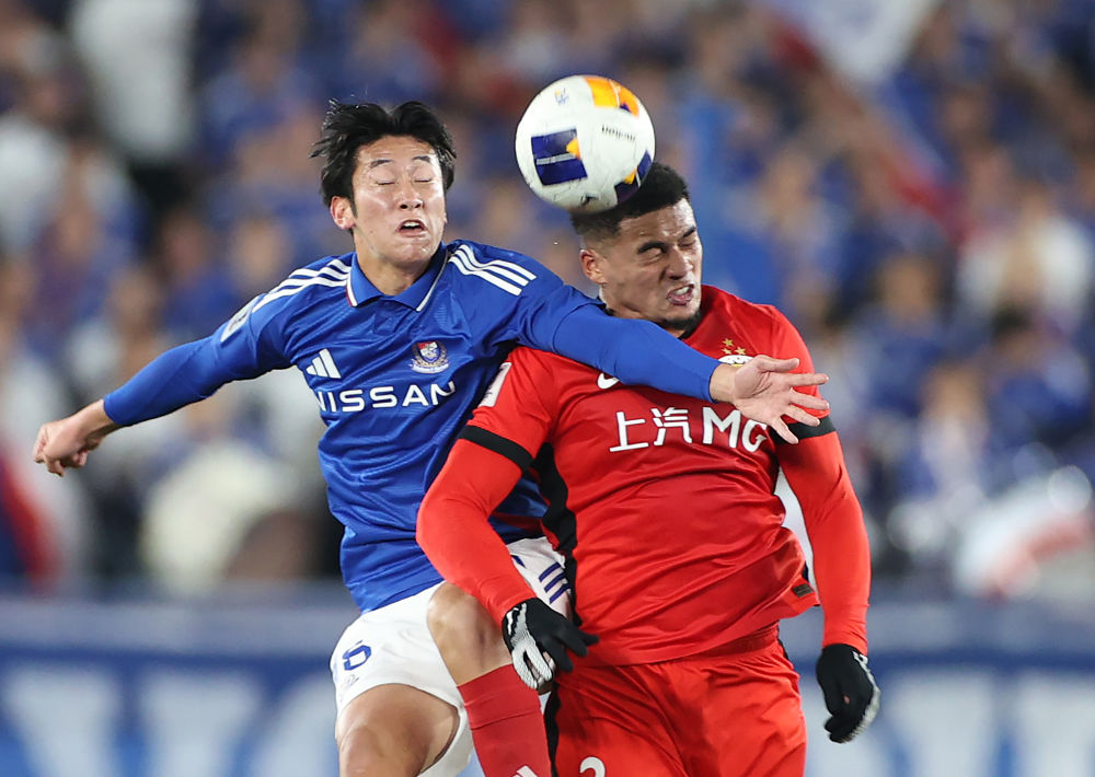 3月11日,上海海港隊(duì)球員蔣光太(右)與橫濱水手隊(duì)球員淺田大翔在比賽中爭(zhēng)頂。新華社記者 賈浩成 攝