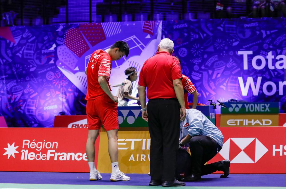 8月27日,中國選手馮彥哲(左)在比賽中接受治療。新華社記者 張帆 攝