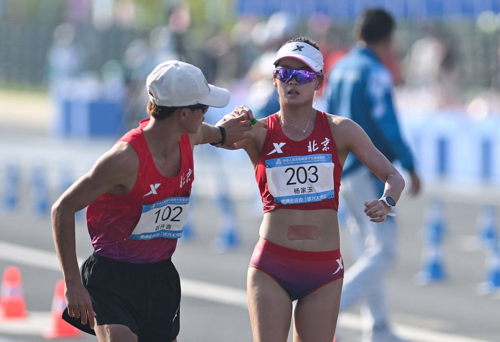 在全運(yùn)會(huì)首次設(shè)立的馬拉松競(jìng)走混合接力中,18歲的石升吉與29歲老將楊家玉攜手,為北京隊(duì)贏得該項(xiàng)目歷史首金。