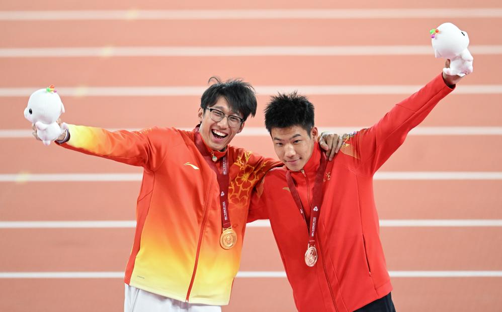 當(dāng)日,田徑項(xiàng)目依然是金牌大戶,共產(chǎn)生12枚金牌。36歲的男子100米亞洲紀(jì)錄保持者蘇炳添成為全場(chǎng)焦點(diǎn),他在家門口的賽道上跑完了職業(yè)生涯的最后100米,帶領(lǐng)一眾“00后”隊(duì)友為廣東隊(duì)奪得男子4×100米接力第四名。盡管未能幫助家鄉(xiāng)隊(duì)伍站上領(lǐng)獎(jiǎng)臺(tái),但蘇炳添仍贏得了滿場(chǎng)掌聲。