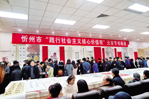 此次書(shū)畫(huà)展共展出我市書(shū)畫(huà)家的書(shū)畫(huà)作品120余幅,以“踐行社會(huì)主義核心價(jià)值觀”為主題,弘揚(yáng)社會(huì)主義法治文化、廉政文化和紅色文化相關(guān)精神,作品充分展示了忻州人民脫貧奔小康的精神風(fēng)貌,凸顯了美麗忻州的山河關(guān)韻、風(fēng)雅神秀和人文底蘊(yùn)。展出的書(shū)畫(huà)作品題材多樣、風(fēng)格迥異,既有我市知名書(shū)畫(huà)作家的大作,也有年輕一輩的佳作,體現(xiàn)了我市書(shū)畫(huà)創(chuàng)作人才濟(jì)濟(jì)的現(xiàn)象。此次書(shū)畫(huà)展吸引了眾多書(shū)畫(huà)愛(ài)好者前來(lái)觀展,現(xiàn)場(chǎng)人頭攢動(dòng),藝術(shù)氛圍濃厚。