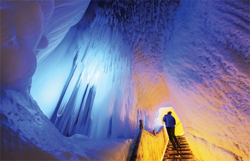 萬年冰洞深100多米,一年四季洞內(nèi)溫度在零下4攝氏度到零下10攝氏度,寒冷無比,積冰常年不化,與洞外形成截然不同的兩個世界。當(dāng)洞外鳥語花香之時,洞內(nèi)卻依然寒氣逼人。在洞內(nèi)冰筍、冰柱、冰錐、冰葡萄等千姿百態(tài),形狀各異的美景奇觀隨處可見。
