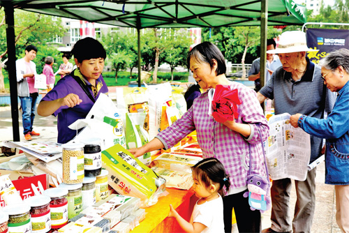 糧油配送中心工作人員在世紀(jì)花苑小區(qū)向居民展示健康食品