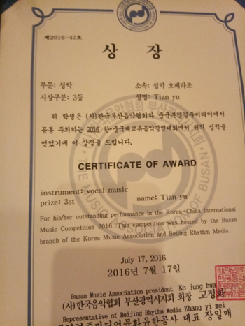 2016年7月18日,韓國釜山舉行的首屆“韓·中國際交流音樂大賽”決賽揭曉。山西省音樂家協(xié)會會員,山西藝術(shù)學(xué)院青年教師,五臺籍青年歌唱家田雨,捧回獎杯,獲得了大賽歌劇詠嘆調(diào)組第三名。