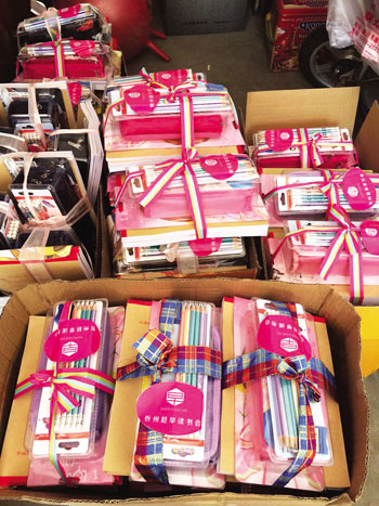 開始給孩子們發(fā)文具了。鉛筆、卷筆刀、作業(yè)本、筆袋,每一個孩子都有這樣一份禮物。因為考慮到孩子們平時很少有機會收到禮物,讀書會會員們加班加點,把這些文具一份份用絲帶打包成漂亮的禮盒,并貼上了趁早讀書會的標(biāo)識。也許孩子們還不理解趁早讀書會是干什么的,但是至少“讀書”二字會讓他們有所感悟和遐想。