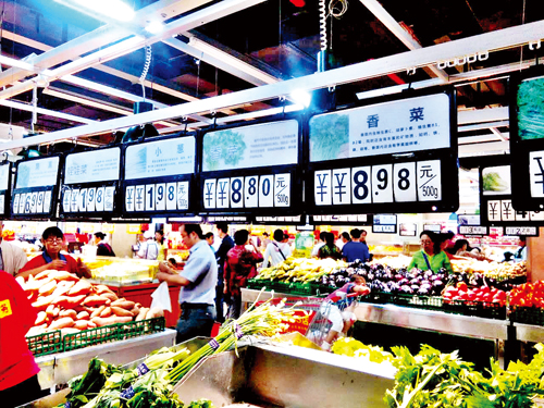 在超市水果專柜上,來自南方的許多熱帶水果價(jià)格偏高,本地和北方產(chǎn)的大眾水果價(jià)格適中。也有部分水果價(jià)格“喜人”,超市正在促銷的一種紅提葡萄品質(zhì)不錯(cuò),售價(jià)3.98元/斤,這個(gè)價(jià)格的紅提葡萄較往年同期便宜了整整一半,顧客爭(zhēng)相選購。圖為9月8日市民在家家利超市購買蔬菜。(魯明強(qiáng) 攝影報(bào)道)