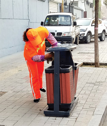 環(huán)衛(wèi)工人擦洗垃圾箱(許凈 攝)