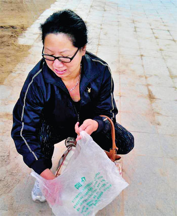 李敏提著塑料袋準(zhǔn)備隨時撿拾垃圾