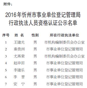 根據(jù)《山西省行政執(zhí)法條例》、《山西省行政執(zhí)法證件管理辦法》及《山西省人民政府法制辦公室關(guān)于進(jìn)一步加強(qiáng)行政執(zhí)法人員資格審查和資格認(rèn)證考試工作的通知》(晉政法字[2015]7號(hào))有關(guān)規(guī)定,下列人員(名單見附件)經(jīng)市機(jī)構(gòu)編制委員會(huì)辦公室資格審查,符合山西省行政執(zhí)法人員資格條件,擬申領(lǐng)山西省行政執(zhí)法證件,現(xiàn)予以公示。