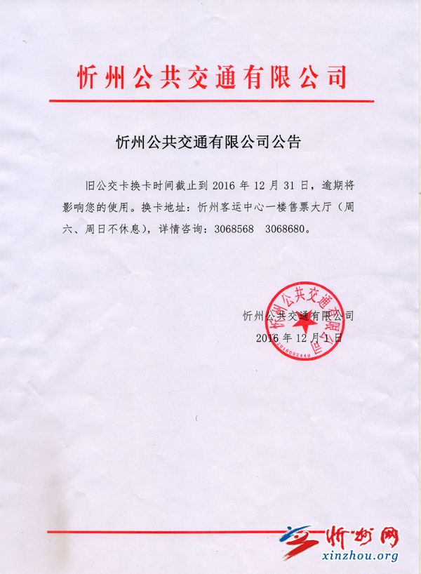 舊公交卡換卡時間截止到2016年12月31日,逾期將影響您的使用。換卡地址:忻州客運中心一樓售票大廳(周六、日不休息),詳情咨詢:3068568 3068680。