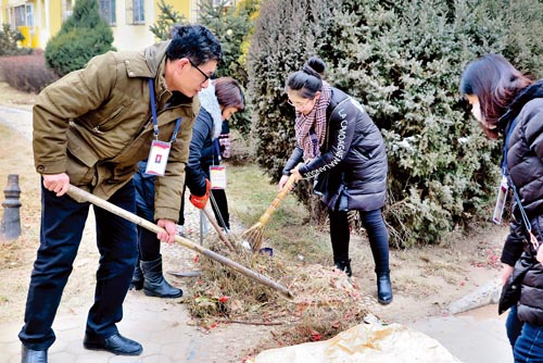 圖為和平西街社區(qū)居委會主任郭如安與工作人員在聚苑小區(qū)清掃。