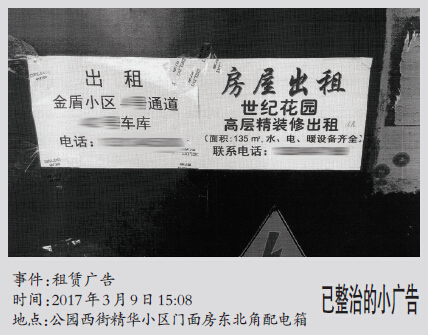 明確責(zé)任、分工合作,形成齊抓共管的整治合力。按照屬地管理、部門監(jiān)管、標(biāo)本兼治的原則,明確各自任務(wù),加強(qiáng)協(xié)作配合,采取疏、堵、查、清等多種措施整合治理,有效控制、徹底根除非法張貼、噴涂、散發(fā)小廣告現(xiàn)象,凈化城區(qū)環(huán)境。通過正面疏導(dǎo)規(guī)范廣告,按照疏堵結(jié)合、便民利民的原則,采取政府投入、市場化運(yùn)作等方式多方籌措資金,在繁華商業(yè)區(qū)、交通樞紐、廣場、居民社區(qū)、街巷胡同等區(qū)域配建統(tǒng)一樣式、統(tǒng)一材質(zhì)、統(tǒng)一管理的便民信息欄,為廣大市民發(fā)布各類合法信息提供便利條件,引導(dǎo)市民愛護(hù)市容。