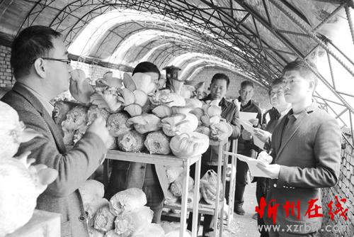 五臺縣神西鄉(xiāng)段家莊村聘請?jiān)睫r(nóng)校食用菌中心負(fù)責(zé)人龐嘉龍,充分利用漫山遍野的花椒樹的廢棄枝、葉、朽木,經(jīng)過科學(xué)加工磨成粉,配置食用菌種,裝袋后滲水上架,用立體種植的方法,培育出了“椒蘑”。這種蘑菇既營養(yǎng)價(jià)值豐富,又可入藥。圖為技術(shù)人員在講解棚內(nèi)椒蘑栽培技術(shù)。(金俊賢 攝)