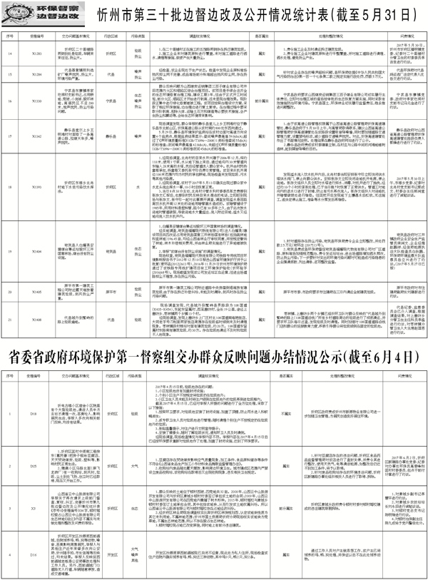 2017年6月4日9時,接收省委省政府環(huán)境保護(hù)第一督察組交辦第七批群眾反映問題8件;按重要性劃分,重點(diǎn)群眾反映問題3件、一般群眾反映問題5件;按區(qū)域分,忻府區(qū)3件、代縣1件、河曲縣1件、原平市1件、神池縣1件、岢嵐縣1件;按污染類型分,大氣2件、噪聲2件、水2件、生態(tài)1件、其他2件。