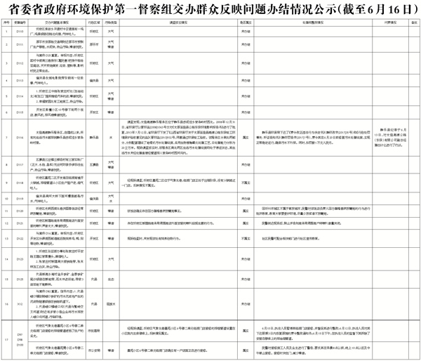 2017年6月16日9時(shí),接收省委省政府環(huán)境保護(hù)第一督察組交辦第十九批群眾反映問題8件;按重要性劃分,一般群眾反映問題8件;按區(qū)域分,忻府區(qū)2件、定襄縣1件、代縣1件、寧武縣1件、保德縣1件、市公安局2件;按污染類型分,大氣4件、水3件、噪音2件、生態(tài)1件。