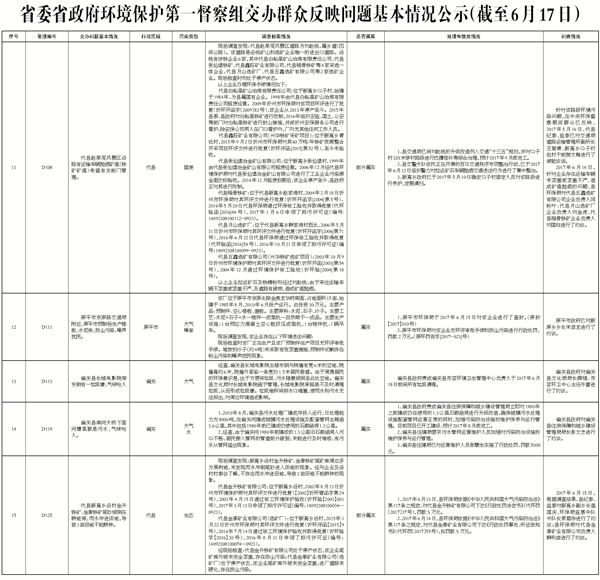 2017年6月17日9時(shí),接收省委省政府環(huán)境保護(hù)第一督察組交辦第二十批群眾反映問題8件;按重要性劃分,一般群眾反映問題8件;按區(qū)域分,忻府區(qū)4件、代縣1件、寧武縣1件、靜樂縣1件、偏關(guān)縣1件;按污染類型分,大氣8件、水2件、噪音2件、固廢1件、垃圾1件。