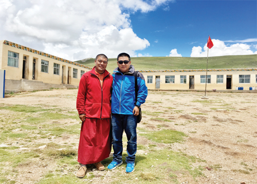 在青海玉樹念經(jīng)湖小學(xué)慈善捐贈(zèng)后與校長(zhǎng)合影留念