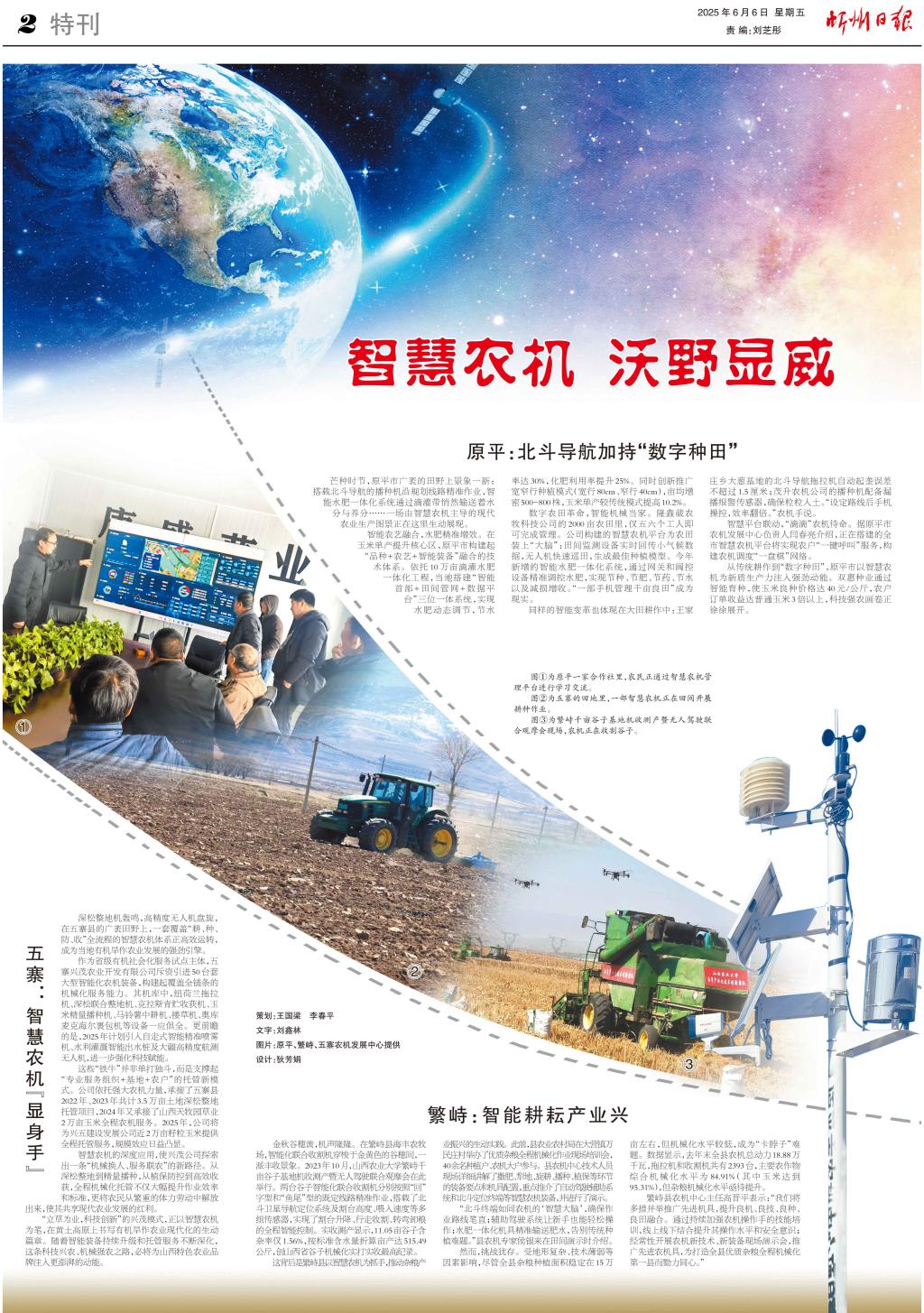 芒種時節(jié),原平市廣袤的田野上景象一新:搭載北斗導航的播種機沿規(guī)劃線路精準作業(yè),智能水肥一體化系統(tǒng)通過滴灌帶悄然輸送著水分與養(yǎng)分……一場由智慧農(nóng)機主導的現(xiàn)代農(nóng)業(yè)生產(chǎn)圖景正在這里生動展現(xiàn)。