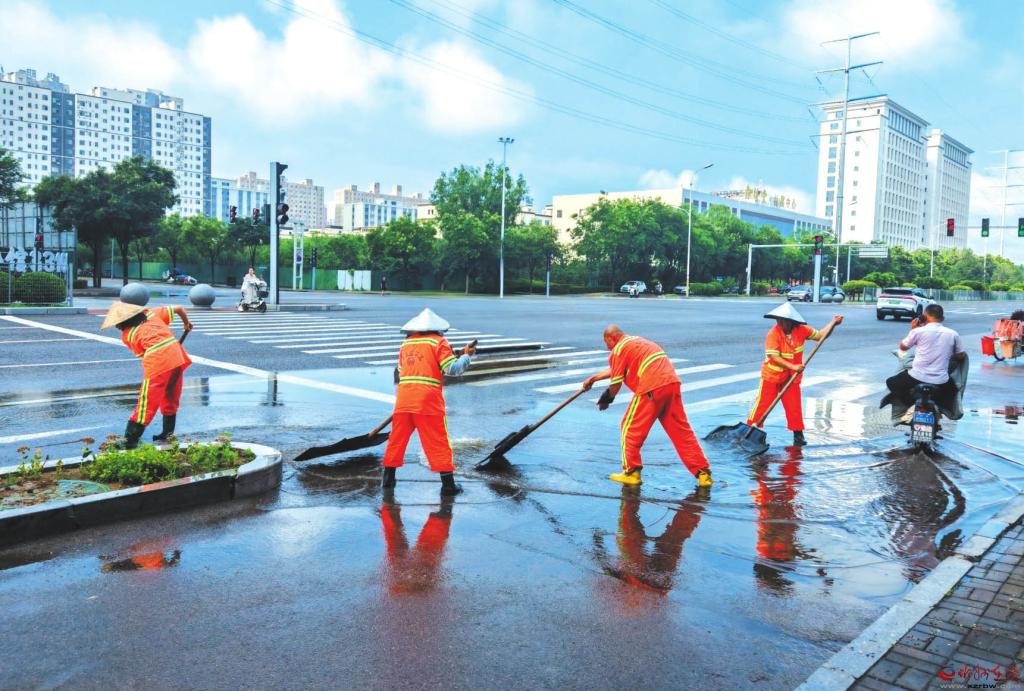 8月5日凌晨,我市降雨天氣造成城區(qū)部分道路路面積水。清晨,環(huán)衛(wèi)工人積極應對雨情,對轄區(qū)內路段開展排水清淤工作,保障市民日常出行。圖為環(huán)衛(wèi)工人在紫檀街路口清理積水。本報記者王陽攝