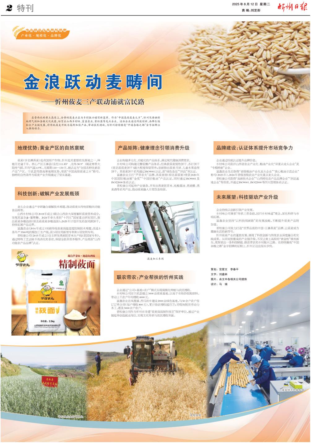 在晉西北的黃土高原上,金黃的莜麥正在為鄉(xiāng)村振興譜寫新篇章。作為“中國高原莜麥之鄉(xiāng)”,忻州憑借獨(dú)特地理氣候和雜糧文化底蘊(yùn),培育出山西鄉(xiāng)村味、富鑫農(nóng)業(yè)、晉??档三堫^企業(yè)。這些企業(yè)通過科技創(chuàng)新、品牌打造和全產(chǎn)業(yè)鏈發(fā)展,將傳統(tǒng)莜麥升級(jí)為高附加值產(chǎn)品,帶動(dòng)農(nóng)民增收,為忻州持續(xù)擦亮“中國雜糧之都”金字招牌注入強(qiáng)勁動(dòng)力。