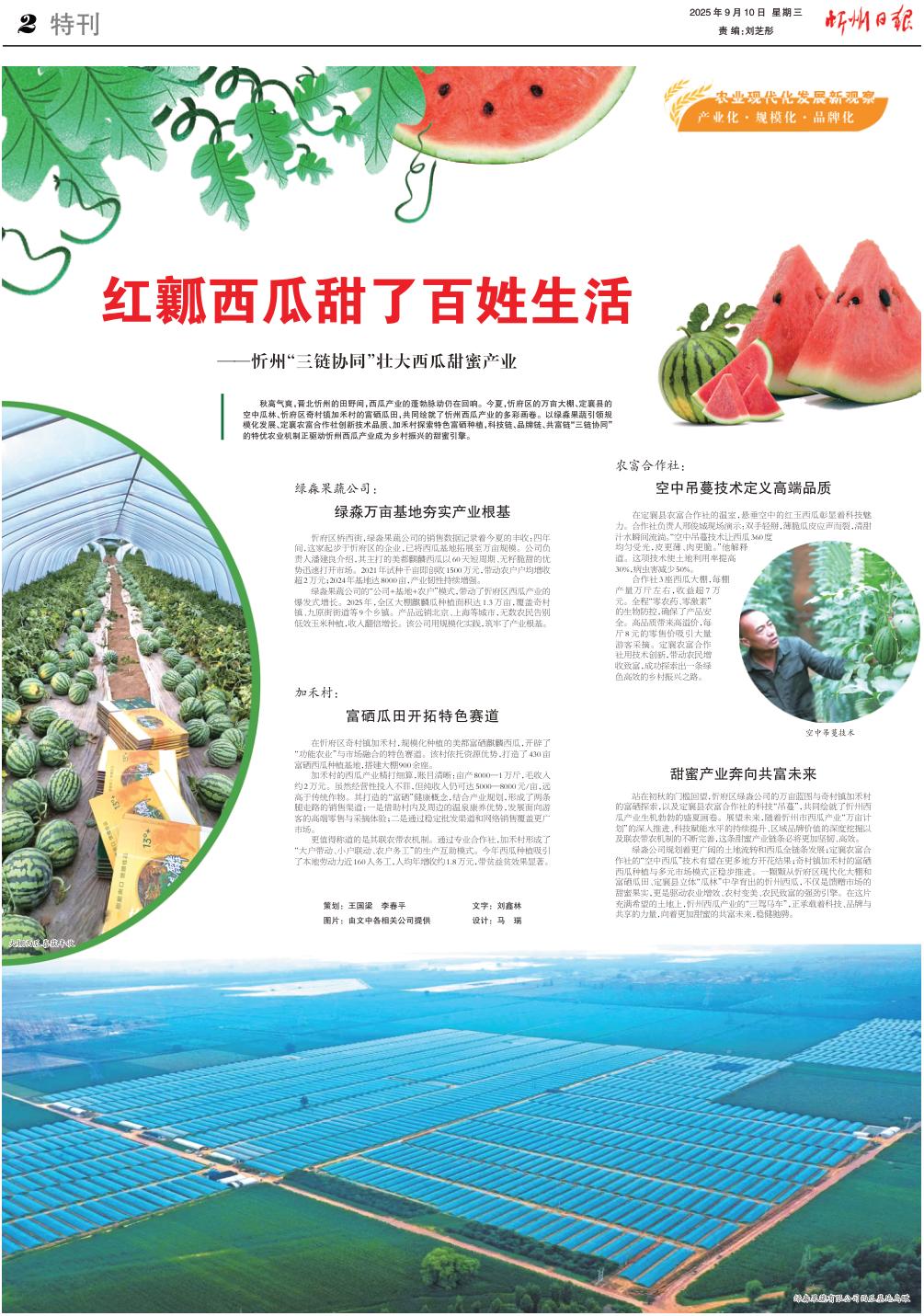 秋高氣爽,晉北忻州的田野間,西瓜產(chǎn)業(yè)的蓬勃脈動仍在回響。今夏,忻府區(qū)的萬畝大棚、定襄縣的空中瓜林、忻府區(qū)奇村鎮(zhèn)加禾村的富硒瓜田,共同繪就了忻州西瓜產(chǎn)業(yè)的多彩畫卷。以綠淼果蔬引領(lǐng)規(guī)?;l(fā)展、定襄農(nóng)富合作社創(chuàng)新技術(shù)品質(zhì)、加禾村探索特色富硒種植,科技鏈、品牌鏈、共富鏈“三鏈協(xié)同”的特優(yōu)農(nóng)業(yè)機制正驅(qū)動忻州西瓜產(chǎn)業(yè)成為鄉(xiāng)村振興的甜蜜引擎。