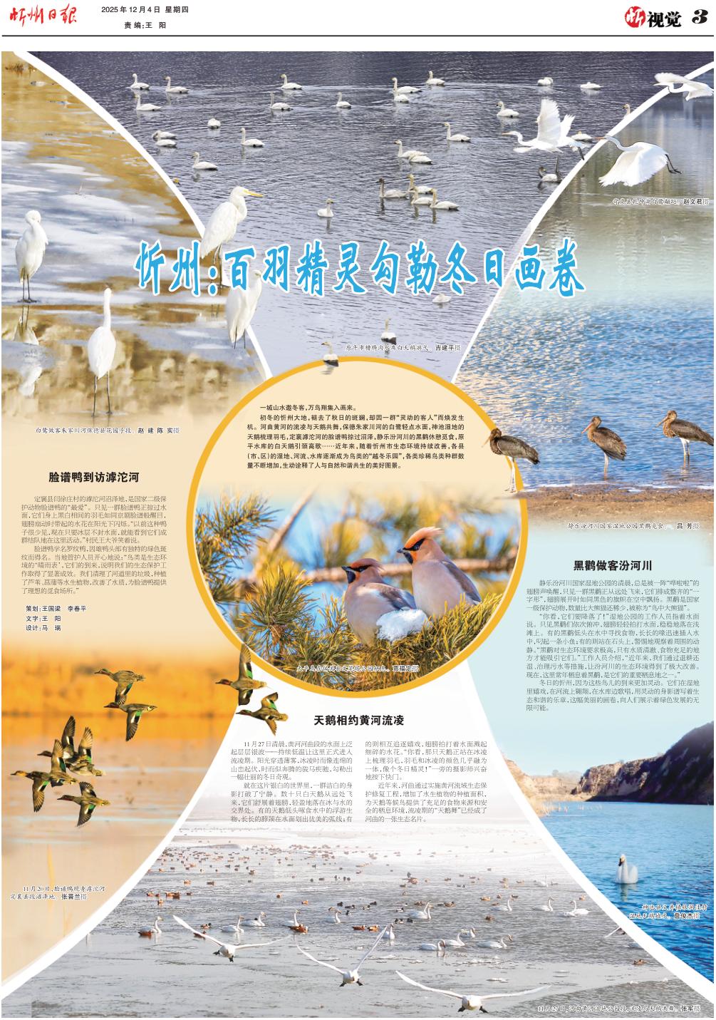 初冬的忻州大地,褪去了秋日的斑斕,卻因一群“靈動的客人”而煥發(fā)生機(jī)。河曲黃河的流凌與天鵝共舞,保德朱家川河的白鷺輕點(diǎn)水面,神池濕地的天鵝梳理羽毛,定襄滹沱河的臉譜鴨掠過沼澤,靜樂汾河川的黑鸛休憩覓食,原平水庫的白天鵝引頸高歌……近年來,隨著忻州市生態(tài)環(huán)境持續(xù)改善,各縣(市、區(qū))的濕地、河流、水庫逐漸成為鳥類的“越冬樂園”,各類珍稀鳥類種群數(shù)量不斷增加,生動詮釋了人與自然和諧共生的美好圖景。