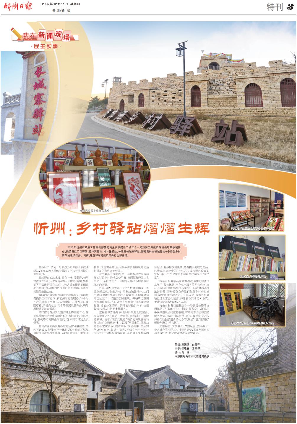 2025年忻州市政府工作報告部署的民生實事提出了沿三個一號旅游公路建設保德縣印象故城驛站,偏關(guān)縣紅門口驛站、乾坤灣驛站、樺林堡驛站,神池縣長城寨驛站,繁峙縣韓莊長城驛站6個特色鄉(xiāng)村驛站的建設任務。目前,這些驛站的建設任務已全部完成。