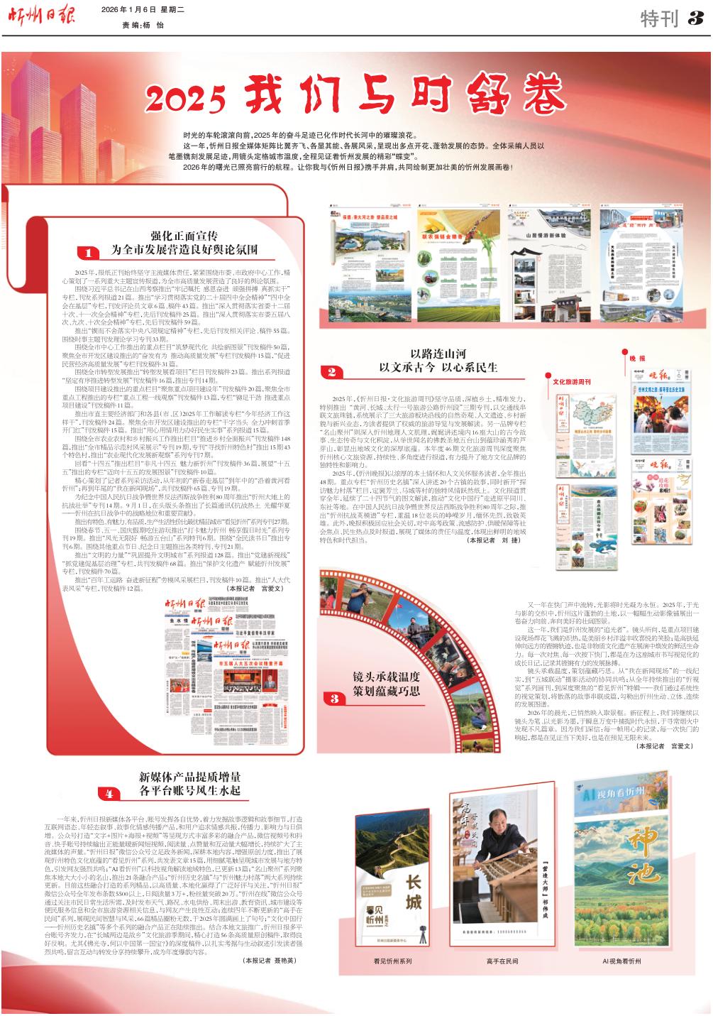 2025年,《忻州晚報(bào)》以濃厚的本土情懷和人文關(guān)懷服務(wù)讀者,全年推出48期。重點(diǎn)專欄“忻州歷史名鎮(zhèn)”深入講述20個(gè)古鎮(zhèn)的故事,同時(shí)新開(kāi)“探訪魅力村落”欄目,定襄芳蘭、馬城等村的獨(dú)特風(fēng)情躍然紙上。文化報(bào)道貫穿全年,延續(xù)了二十四節(jié)氣的圖文解讀,推動(dòng)“文化中國(guó)行”走進(jìn)原平同川、東社等地。在中國(guó)人民抗日戰(zhàn)爭(zhēng)暨世界反法西斯戰(zhàn)爭(zhēng)勝利80周年之際,推出“忻州抗戰(zhàn)英模譜”專欄,重溫18位老兵的崢嶸歲月,緬懷先烈,致敬英雄。此外,晚報(bào)積極回應(yīng)社會(huì)關(guān)切,對(duì)中高考政策、流感防護(hù)、供暖保障等社會(huì)焦點(diǎn)、民生熱點(diǎn)及時(shí)報(bào)道,展現(xiàn)了媒體的責(zé)任與溫度,體現(xiàn)出鮮明的地域特色和時(shí)代擔(dān)當(dāng)。(本報(bào)記者劉捷)