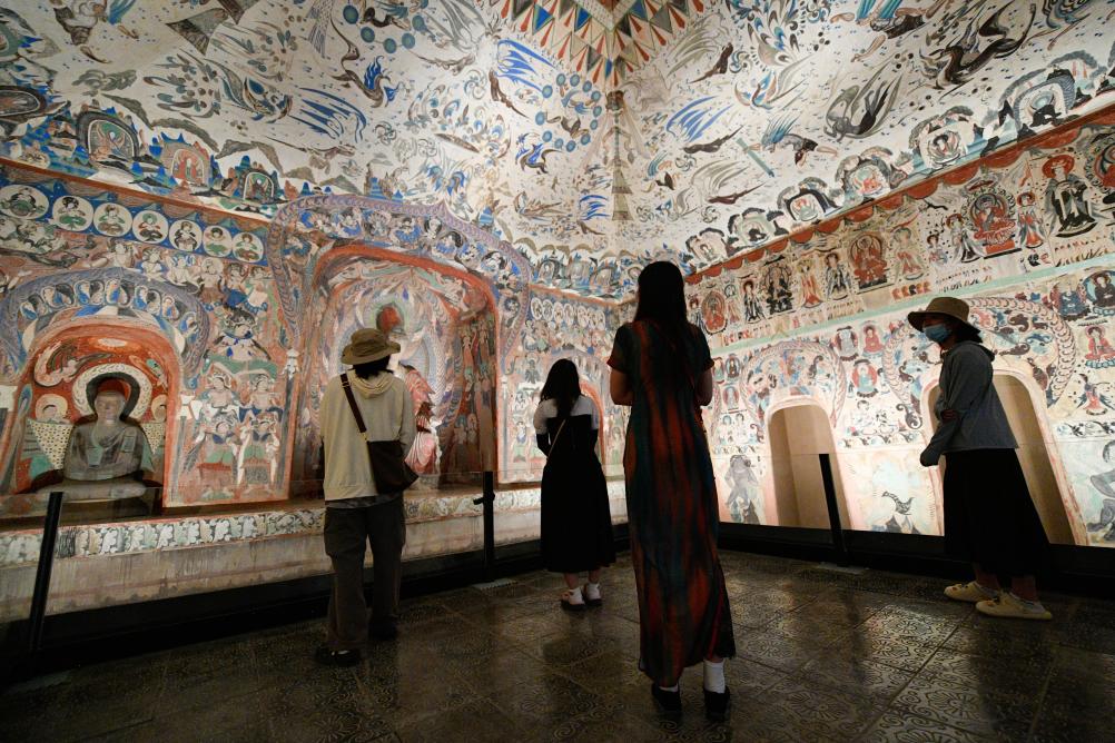 2024年6月7日,在敦煌石窟文物保護(hù)研究陳列中心,游客參觀莫高窟復(fù)制洞窟第276窟壁畫(huà)。新華社記者 郎兵兵 攝