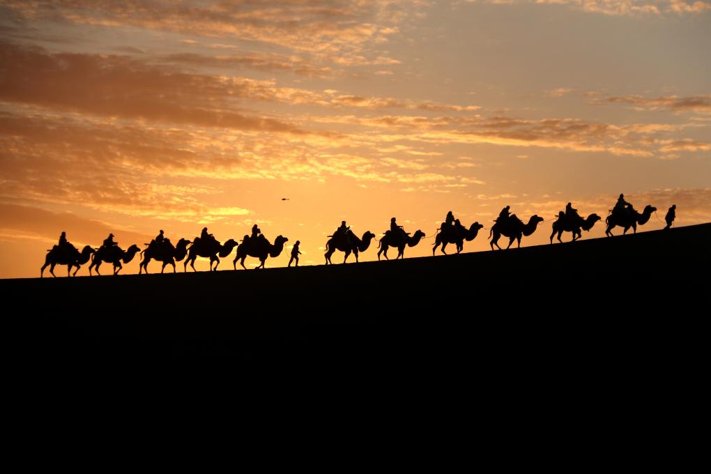 月牙泉是沙漠的眼睛,依舊倒映著漢唐的明月。駝隊(duì)曾經(jīng)從這里經(jīng)過(guò),駝鈴聲串起長(zhǎng)安與羅馬的夢(mèng)。絲綢是流動(dòng)的彩虹,瓷器是凝固的月光,經(jīng)卷里藏著智慧的種子,在歐亞大陸上生根發(fā)芽。
