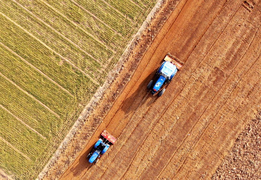 2月18日,山東省臨沂市平邑縣平邑街道農(nóng)民駕駛農(nóng)機在翻耕土地(無人機照片)。新華社發(fā)(武紀(jì)全 攝)