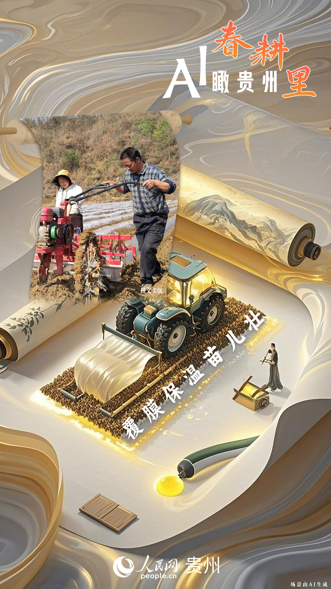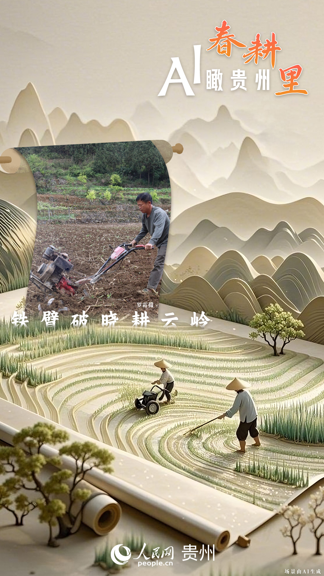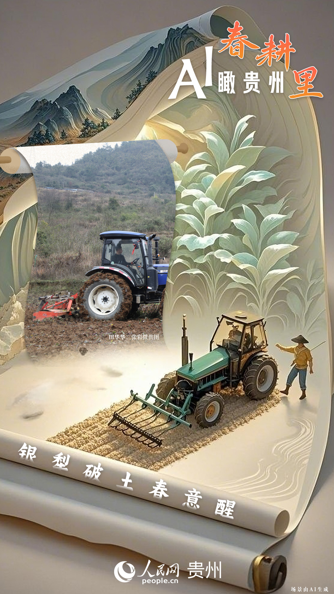 春回大地,萬物復(fù)蘇,黔地山川間正上演著一場生機(jī)勃勃的春耕盛景。傳統(tǒng)農(nóng)耕與現(xiàn)代科技在這里交織,描繪出一幅幅充滿希望的畫卷。 春耕不僅是農(nóng)時(shí)的序曲,更是科技與土地對話的現(xiàn)場。在貴州這片喀斯特地貌與民族文化交織的土地上,春耕正經(jīng)歷一場靜默的變革:無人機(jī)掠過千年梯田,算法解析紅壤墑情,覆膜機(jī)織就“智能外衣”,而彎腰勞作的農(nóng)人,依然用繭手傳遞著古老農(nóng)耕文明的溫度。 本期跟隨AI一起描繪貴州春耕里的故事。