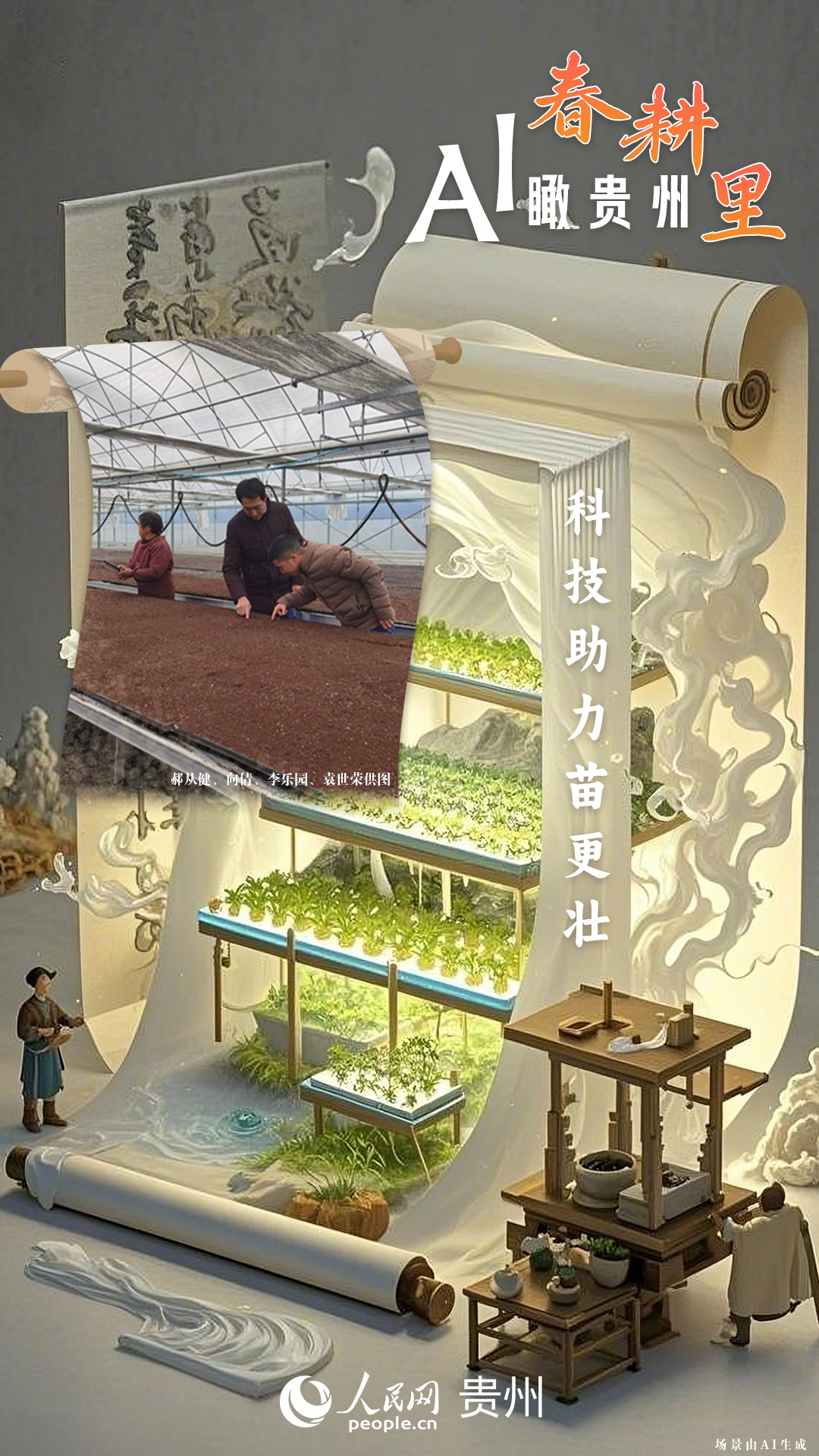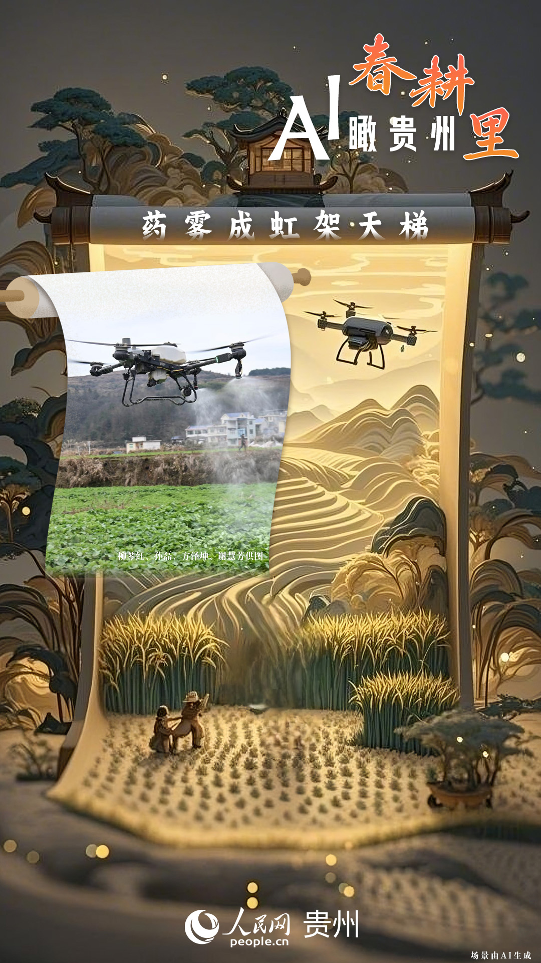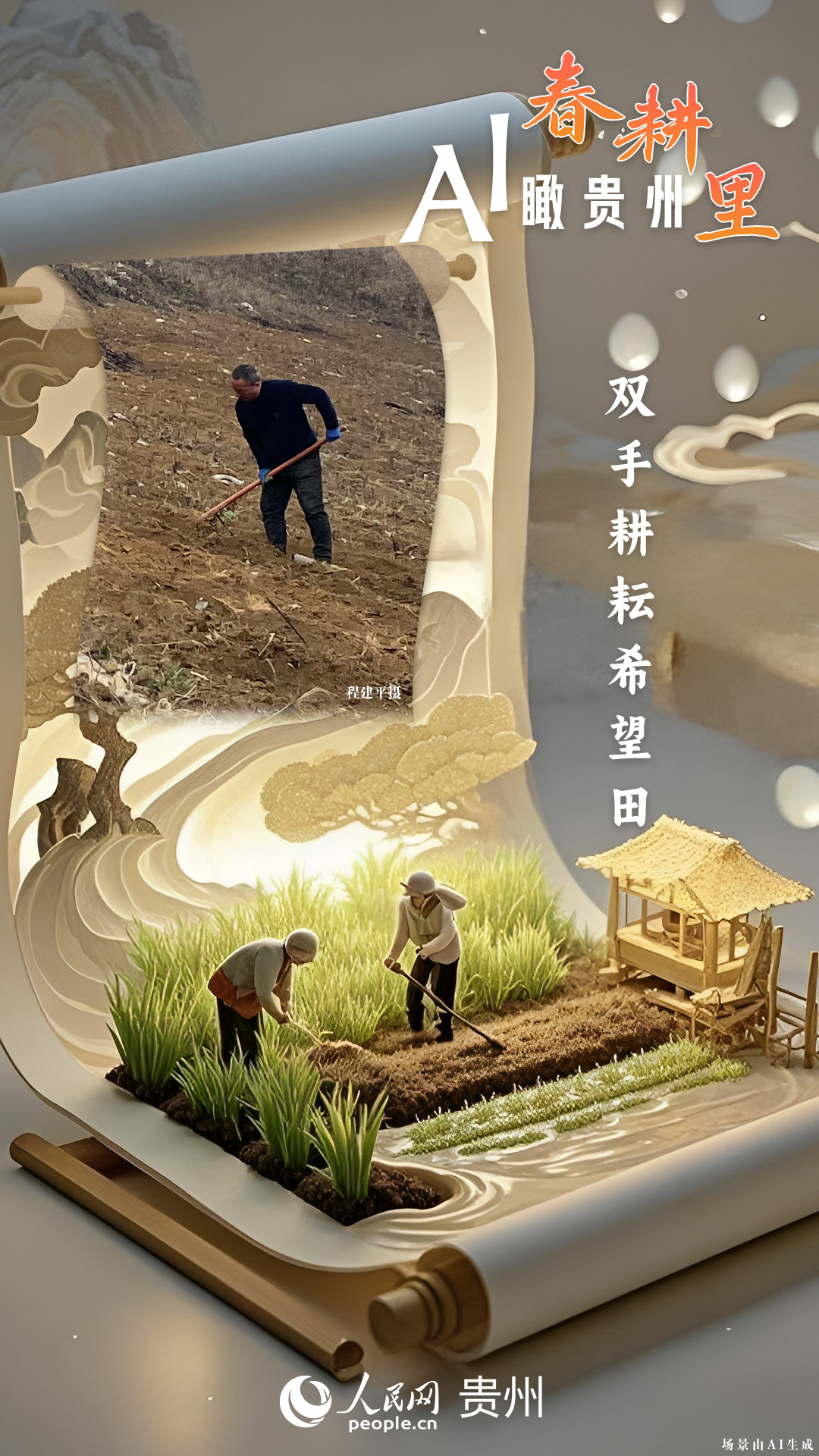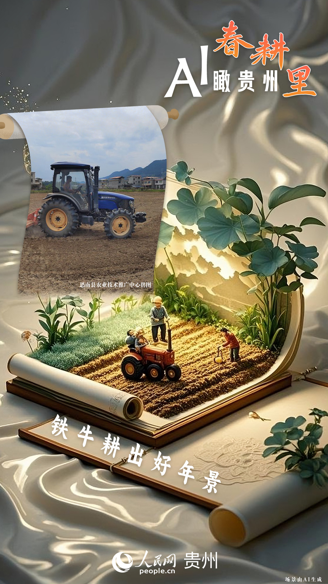 春回大地,萬物復(fù)蘇,黔地山川間正上演著一場生機(jī)勃勃的春耕盛景。傳統(tǒng)農(nóng)耕與現(xiàn)代科技在這里交織,描繪出一幅幅充滿希望的畫卷。 春耕不僅是農(nóng)時(shí)的序曲,更是科技與土地對話的現(xiàn)場。在貴州這片喀斯特地貌與民族文化交織的土地上,春耕正經(jīng)歷一場靜默的變革:無人機(jī)掠過千年梯田,算法解析紅壤墑情,覆膜機(jī)織就“智能外衣”,而彎腰勞作的農(nóng)人,依然用繭手傳遞著古老農(nóng)耕文明的溫度。 本期跟隨AI一起描繪貴州春耕里的故事。