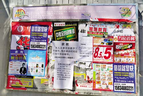 情況一:記者近日在忻州城區(qū)和平街一路口看到,一塊為市民提供告知服務(wù)的“便民公告欄”明確提示不允許張貼任何商業(yè)廣告,可是如今上面卻貼滿了商業(yè)廣告,而且張貼得極不整齊,這成為影響市容環(huán)境的一處死角,希望相關(guān)部門及時清理,也希望廣大市民按要求發(fā)布便民信息。