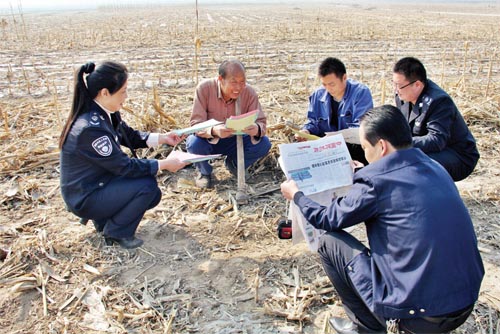 為了將《中華人民共和國大氣污染防治法》和《五臺縣人民政府嚴防森林火災的通告》宣傳到戶、到人,五臺縣環(huán)保局組織工作人員,分組劃片深入到田間地頭,面對面讀報給農(nóng)民聽,為農(nóng)民解釋燒秸稈、燒荒等野外違規(guī)用火行為的危害。臺城鎮(zhèn)西關(guān)村66歲的農(nóng)民張存在說:“你們這樣解釋,咱懂。我家4畝地的秸稈保證不燒一根。”圖為五臺縣環(huán)保局工作人員在田間地頭宣傳環(huán)境保護相關(guān)知識。(金俊賢 辛宇 攝影報道)