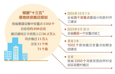 “十三五”易地扶貧搬遷啟動(dòng)以來,我省有36.2萬貧困人口告別山莊窩鋪,搬進(jìn)了公共設(shè)施配套齊全、產(chǎn)業(yè)就業(yè)措施完善的1502個(gè)易地扶貧搬遷集中安置點(diǎn),這些安置點(diǎn)已成為貧困群眾穩(wěn)定脫貧的新起點(diǎn)、走向全面小康的新支點(diǎn)、實(shí)現(xiàn)鄉(xiāng)村振興的新亮點(diǎn)。