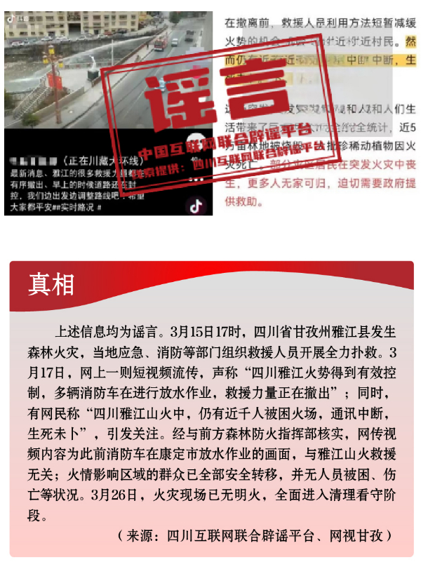 為博流量炮制安全類謠言,引發(fā)恐慌。春季歷來是森林火災(zāi)高發(fā)時段。加之開春后,工廠企業(yè)復(fù)產(chǎn)復(fù)工,致災(zāi)因素明顯增多。3月,全國多地發(fā)生火災(zāi)事故,一些網(wǎng)民為蹭熱點、博流量,趁機(jī)編織謠言,引發(fā)公眾恐慌。3月中旬,四川省甘孜州雅江縣發(fā)生森林火災(zāi),在當(dāng)?shù)貞?yīng)急、消防等部門組織救援人員全力撲救之際,卻有人編造“四川雅江山火救援力量正在撤出”“雅江仍有近千人被困火場”“雅江山火有三名撲火人員犧牲”等失實信息,嚴(yán)重干擾災(zāi)害應(yīng)急響應(yīng)和救援工作?!爸貞c南坪商業(yè)大樓火災(zāi)傷亡慘重”“湖南省長沙市天心區(qū)發(fā)生重大刑案,警方發(fā)布懸賞通告”“天津一銀行發(fā)生搶劫”等嚴(yán)重失實的涉公共安全類視頻流傳網(wǎng)絡(luò),或是造謠者自編自導(dǎo),或是利用AI技術(shù)偽造,卻引發(fā)群眾恐慌、造成惡劣影響。此外,“綠得發(fā)黑的菠菜不能吃”“清明蔗、毒過蛇”等食品安全類謠言,則是利用了時令和人們對食物中毒的擔(dān)憂情緒,夸大其詞、危言聳聽,目的都是販賣焦慮、制造恐慌,進(jìn)而吸引眼球、騙取流量。